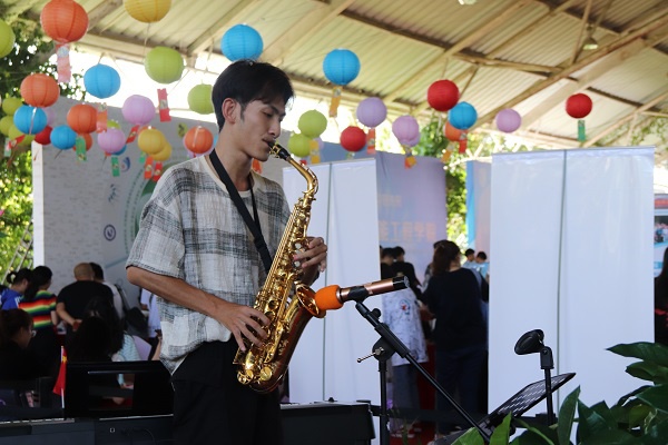 紧接着是逯江波同学带来的萨克斯演奏,他的表演清新悠扬,节奏流畅,极具富有艺术感染力,一时间优美的旋律回响在迎新现场。