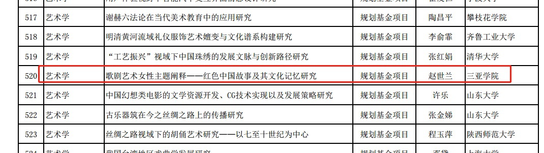 2021年教育部人文社会科学研究一般项目评审结果已公示,3044am永利集团赵世兰教授的规划基金项目《歌剧艺术女性主题阐释——红色中国故事及其文化记忆研究》已获立项。