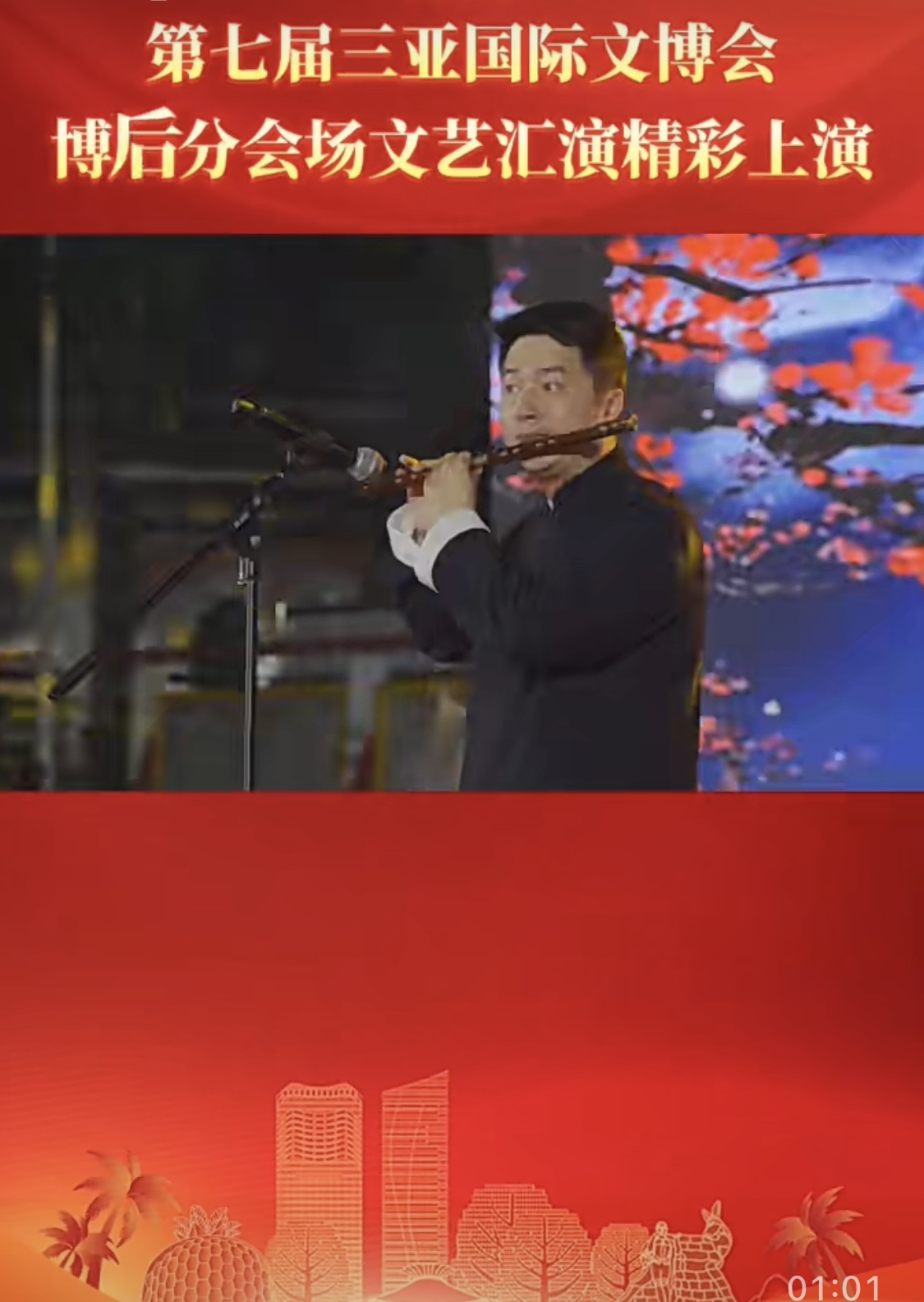 2023年1月1日新年开始,公司竹笛教师徐升应邀参加中共三亚市委宣传部主办、中共三亚市吉阳区委宣传部承办的《第七届三亚国际文博会博后分会场文艺汇演》。