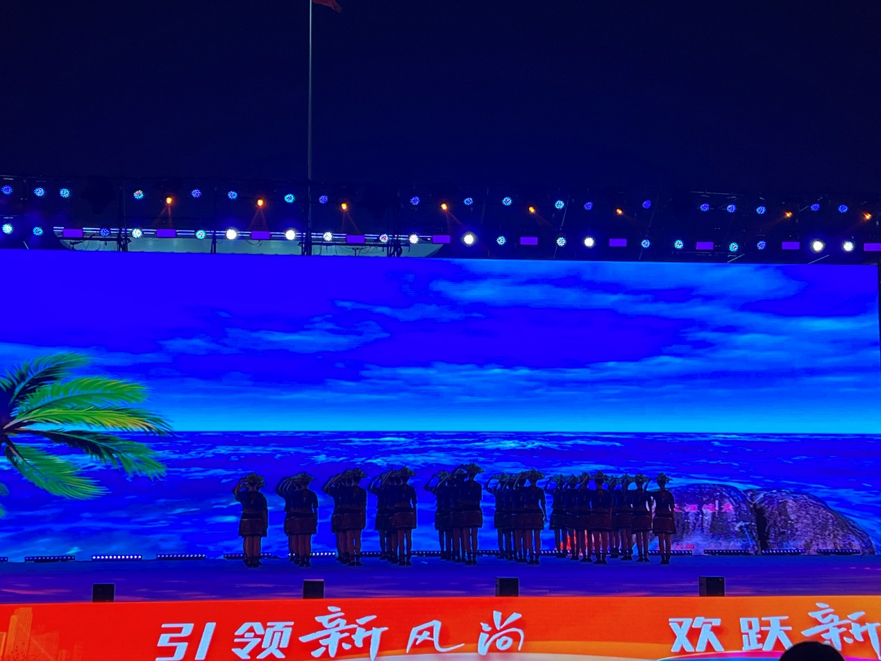 在灯光的照射下,32张笑脸愈发灿烂,动作整齐有力,队形变化丰富精彩,队员们配合默契。伴随着海风海浪的声音,背景呈现着海水和椰树,搭配演员手上的编织竹帽,更是体现了海南劳动人民风土人情,把三亚海之景深深刻画在观众心中,令人心往神移。